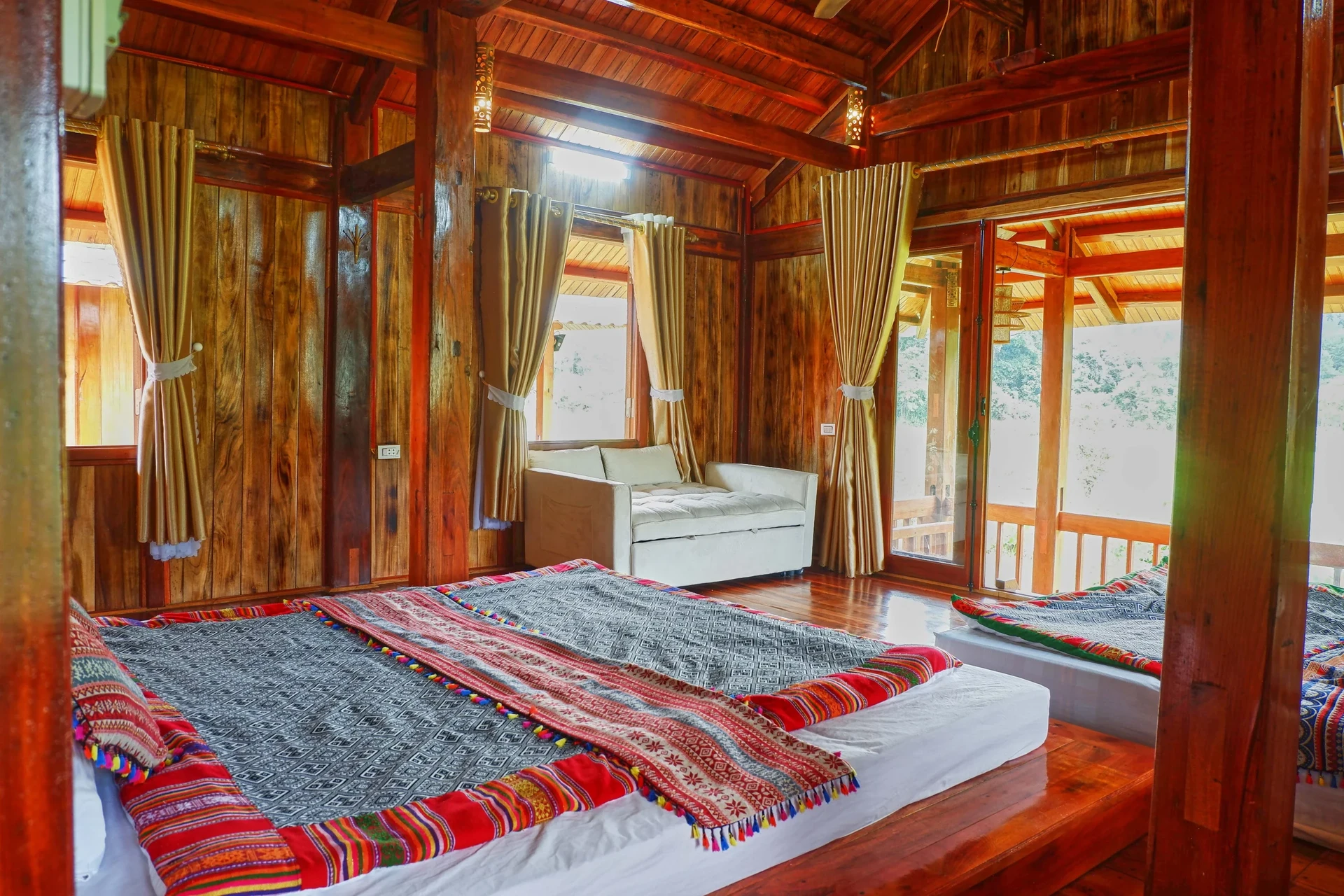 Điểm đặc biệt là chăn ga, gối nệm đều làm từ vải thổ cẩm – sản phẩm thủ công tinh xảo của người Thái, giúp bạn vừa nghỉ ngơi thoải mái vừa cảm nhận được tinh hoa văn hóa dân tộc.