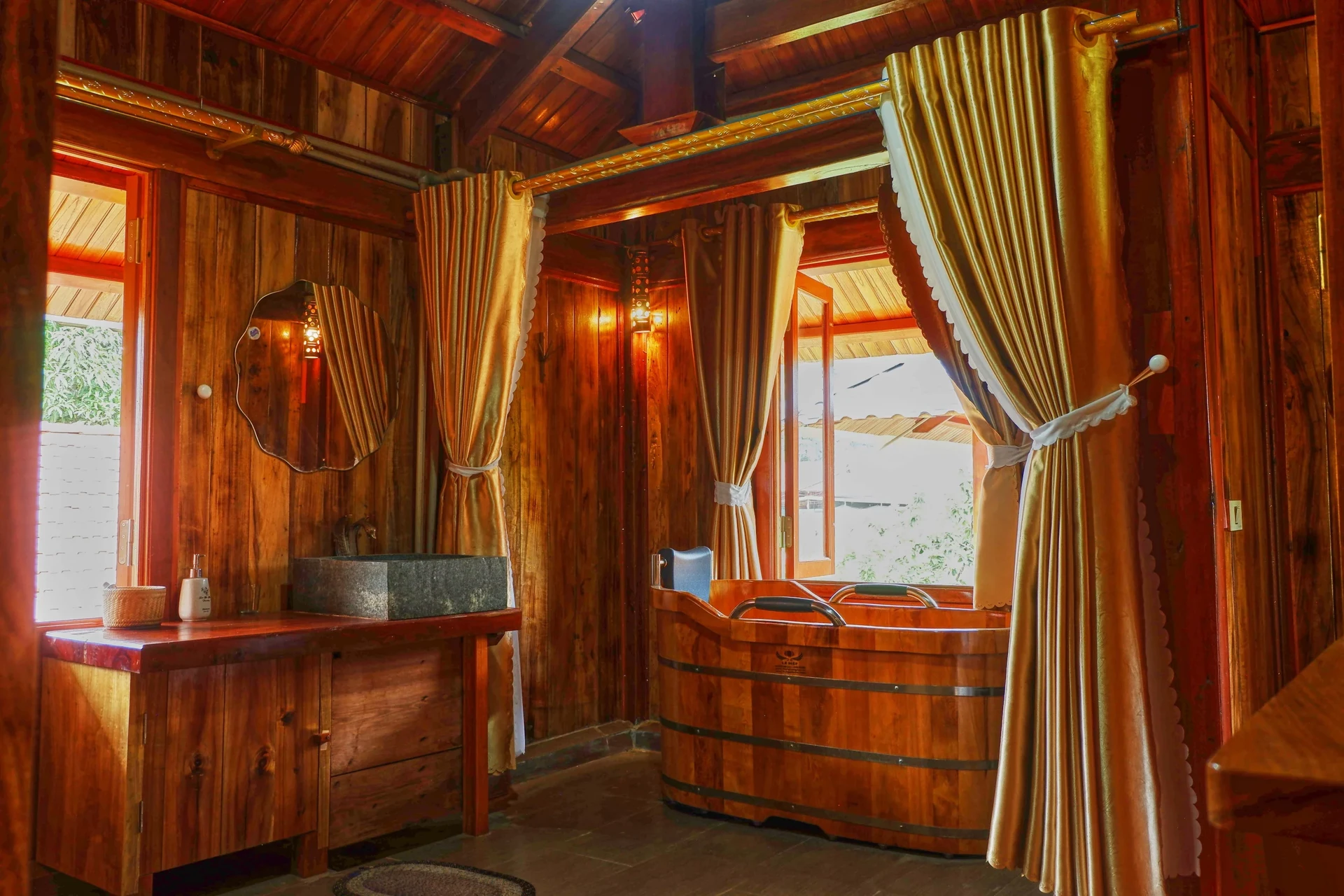 - Lưu trú trong những căn phòng gỗ ấm áp, đậm chất Tây Bắc, đầy đủ tiện nghi.